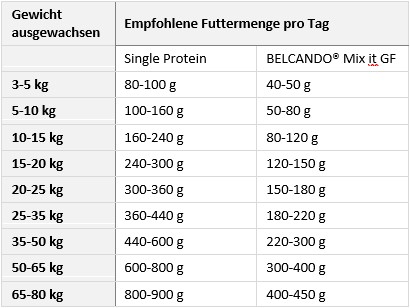 Für eine ausgewogene Ernährung empfehlen wir die Fütterung von 2 Teilen BELCANDO® SINGLE PROTEIN Pferd + 1 Teil BELCANDO® Mix it GF Trockennahrung. Durchschnittswerte für die Fütterung von ausgewachsenen, normal aktiven Hunden sind in der abgebildeten Tabelle aufgeführt. Die richtige Fütterungsmenge lässt sich am besten über eine regelmäßige Gewichtskontrolle des Hundes ermitteln. Frisches Trinkwasser sollte immer zur freien Verfügung stehen. Nach dem Öffnen max. 24 Stunden im Kühlschrank aufbewahren.